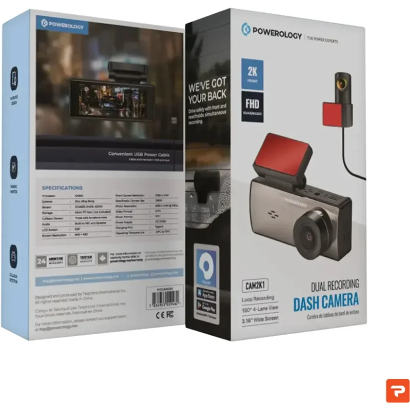 دوربین داشبورد ضبط دوگانه Powerology به رنگ مشکی براق یک مدل ابزار برای افزایش امنیت و راحتی هنگام رانندگی است. با بدنه آلیاژ روی مجهز به پردازنده SA830، این یک دوربین داشبورد قابل اعتماد برای عملکرد طولانی مدت است. مجهز به سنسور پیشرفته GC4653 CMOS. فیلم دوربین جلو با رزولوشن 2560 در 1440 و فیلم عقب/درون با کیفیت Full HD 1080p. مجهز به صفحه نمایش LCD 3.16 اینچی و وضوح 640 در 480، نمای وسیع و دقیقی را برای پخش و نظارت آسان ارائه می دهد. لنز زاویه باز 150 درجه تا 4 خط را پوشش می دهد و دید وسیعی از جاده را ارائه می دهد. همچنین با یک شتابسنج سه محوره طراحی شده است که به تشخیص برخورد، ضبط حلقه و عملکردهای مانیتور پارک کمک میکند تا اطمینان حاصل شود که وسیله نقلیه شما حتی در زمان پارک ایمن است. دوربین داشبورد دارای فضای ذخیرهسازی قابل ارتقا از طریق کارت Micro TF است که شامل آن نمیشود. برای مدیریت آسان فایل ها، فیلم ها را با فرمت MP4 و عکس ها را با فرمت JPG ذخیره می کند. این دوربین دارای میکروفون و بلندگوی یکپارچه برای ضبط و پخش صدا می باشد. علاوه بر این، دمای عملیاتی -10 درجه سانتیگراد تا 70 درجه سانتیگراد است. این دوربین می تواند در شرایط آب و هوایی مختلف کار کند. این دستگاه از طریق یک درگاه شارژ Type-C با منبع تغذیه 5V/2A برای شارژ سریع و مطمئن تغذیه می شود.