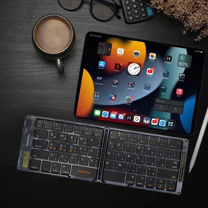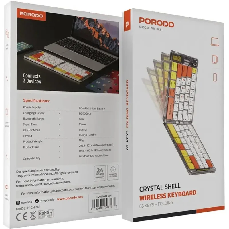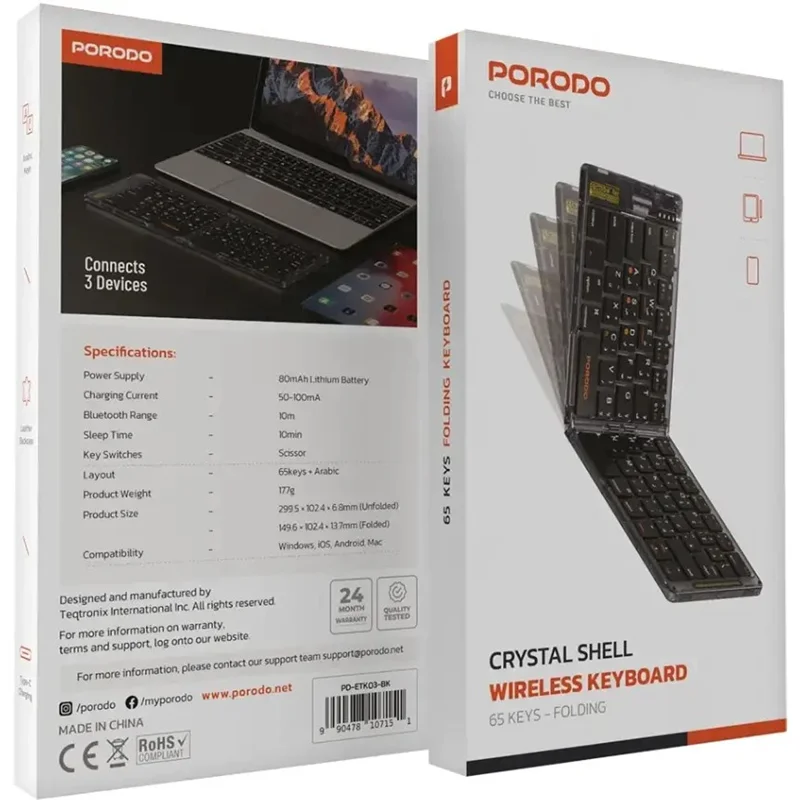 کیبورد بیسیم Porodo Crystal Shell باریک، جمعوجور و قابل حمل است. کارایی و تطبیقپذیری برای تایپ با باتری لیتیومی ۸۰ میلیآمپر ساعتی آن، با عملکرد مداوم بلوتوث تا برد ۱۰ متر، برای کار یا مطالعه در حال حرکت ایدهآل است. این کیبورد مجهز به کلیدهای قیچی شکل است و دارای طرحبندی ۶۵ کلیدی شامل زبان عربی است که در نهایت به کاربران دو زبانه اجازه میدهد از تایپ روان و سریع لذت ببرند. این کیبورد همچنین با ویندوز، iOS، اندروید و مک سازگار است. به راحتی به دستگاهها متصل میشود. در این طراحی تاشو، یک قاب پشتی چرمی برای دوام و ایجاد حس شیکتر برای حمل و نقل بیشتر وجود دارد. این دستگاه مجهز به پورت شارژ Type-C است و با سرعت ۵۰ تا ۱۰۰ میلیآمپر شارژ میشود. زمان خواب ۱۰ دقیقه است که باعث صرفهجویی در مصرف انرژی میشود. کیبورد بیسیم Porodo Crystal Shell جمعوجور، شیک و کارآمد است و بدون از دست دادن عملکرد، آن را راحت میکند.