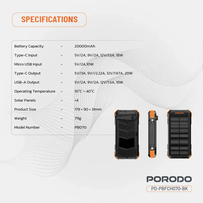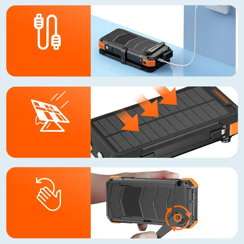 پاوربانک خورشیدی پرودو مدل 4-Panel با ظرفیت ۲۰۰۰۰ میلیآمپر ساعت یک انتخاب بینظیر برای ماجراجوییهای خارج از منزل و شرایط اضطراری است. این پاوربانک با داشتن ۴ پنل خورشیدی به شما امکان شارژ با انرژی خورشیدی را میدهد، و در کنار آن از قابلیت شارژ دستی (Hand Crank) نیز برخوردار است.