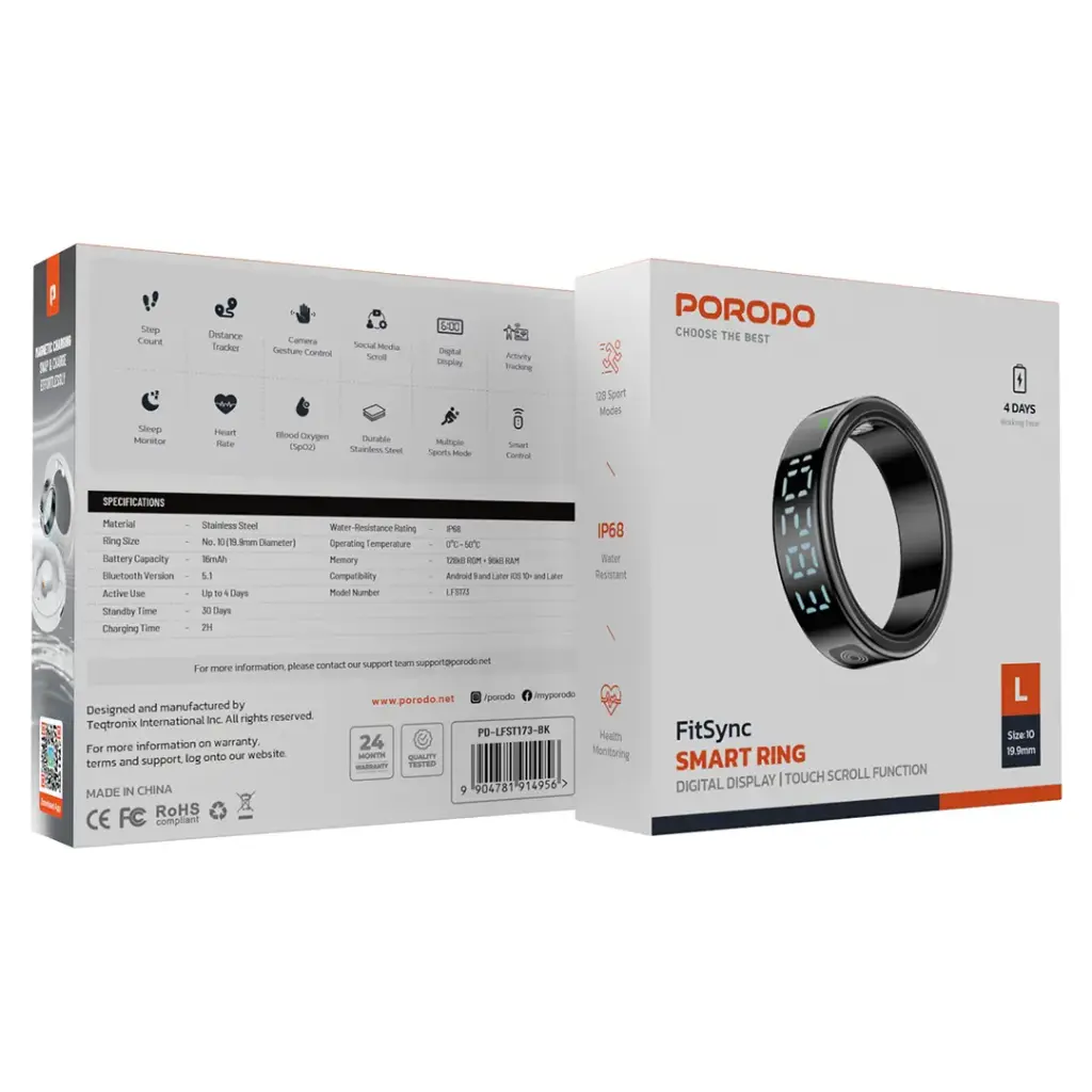 حلقه هوشمند Porodo FitSync یک پوشیدنی شیک و کاربردی است که از جنس استیل ضد زنگ با در نظر گرفتن دوام ساخته شده است. این حلقه با اندازه 10 اینچ (قطر 19.9 میلیمتر) راحتی را برای استفاده روزمره فراهم میکند. این حلقه با باتری 16 میلیآمپر ساعتی خود میتواند تا 4 روز در حالت استفاده فعال و تا 30 روز در حالت آماده به کار پس از تنها 2 ساعت شارژ دوام بیاورد. بلوتوث 5.1 اتصال روان و پایداری را با دستگاههای اندروید 9+ و iOS 10+ تضمین میکند. حلقه هوشمند FitSync 128 حالت ورزشی ارائه میدهد، بنابراین میتوانید چندین فعالیت را پیگیری کنید، در حالی که ویژگیهای سلامتی، تناسب اندام و سلامت عمومی شما را کنترل میکنند. این حلقه همچنین از یک صفحه ساعت دیجیتال پشتیبانی میکند. همچنین کنترل هوشمند و کنترل حرکت دوربین برای کار بدون دخالت دست وجود دارد. این حلقه دارای رتبه IP68 برای مقاومت در برابر آب و بسیار بادوام است تا از هرگونه سوءاستفادهای که در چالشهای روزانه وجود دارد جلوگیری کند. حلقه هوشمند Porodo FitSync از نظر سبک، عملکرد و دوام، ایدهآل برای یک سبک زندگی فعال است.